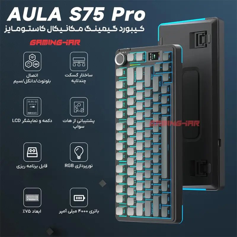 کیبورد گیمینگ AULA S75 PRO یکی از حرفه‌ای‌ترین و پیشرفته‌ترین کیبوردهای مکانیکی حال حاضر بازار است که با تمرکز بر نیاز گیمرها، کاربران حرفه‌ای و افرادی که به شخصی‌سازی اهمیت می‌دهند طراحی شده است. این کیبورد با بهره‌گیری از طراحی 75 درصدی، اتصال سه‌حالته، نمایشگر LCD هوشمند، نورپردازی RGB پیشرفته و ساختار داخلی حرفه‌ای، تجربه‌ای فراتر از یک کیبورد معمولی را ارائه می‌دهد.