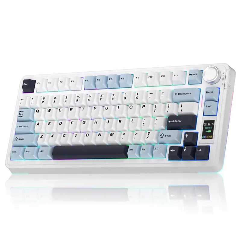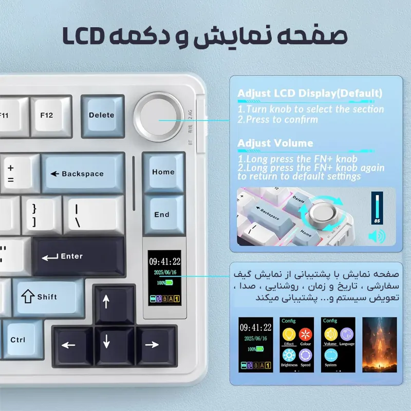 یکی از جذاب‌ترین ویژگی‌های AULA S75 PRO، نمایشگر LCD تعبیه‌شده روی بدنه کیبورد است. این صفحه‌نمایش به‌عنوان یک رابط تعاملی عمل می‌کند و اطلاعات کاربردی متعددی را در لحظه نمایش می‌دهد؛ از وضعیت باتری، تاریخ و ساعت گرفته تا حالت اتصال، افکت نورپردازی، میزان صدا و حتی نمایش GIF دلخواه.