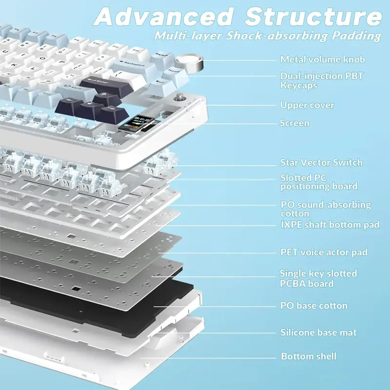 در طراحی داخلی AULA S75 PRO از ساختار Gasket Mount به همراه چندین لایه عایق صدا استفاده شده است. وجود پد سیلیکونی یکپارچه، اسلات‌بندی PCB و پنج لایه فوم کاهش‌دهنده نویز، باعث شده لرزش، صدای توخالی و ضربه کلیدها به حداقل برسد.