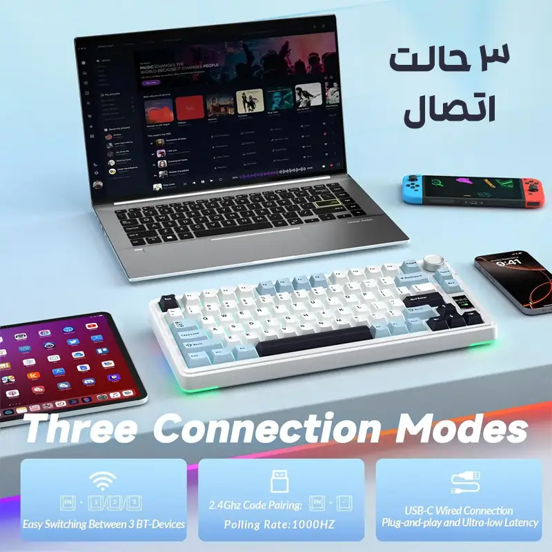 کیبورد گیمینگ AULA S75 PRO از سه حالت اتصال پشتیبانی می‌کند: بلوتوث 5.0، اتصال بی‌سیم 2.4GHz و اتصال سیمی USB-C. با استفاده از کلید کناری، می‌توانید به‌سرعت بین حالت‌ها جابه‌جا شوید و کیبورد را روی دستگاه‌های مختلف استفاده کنید.